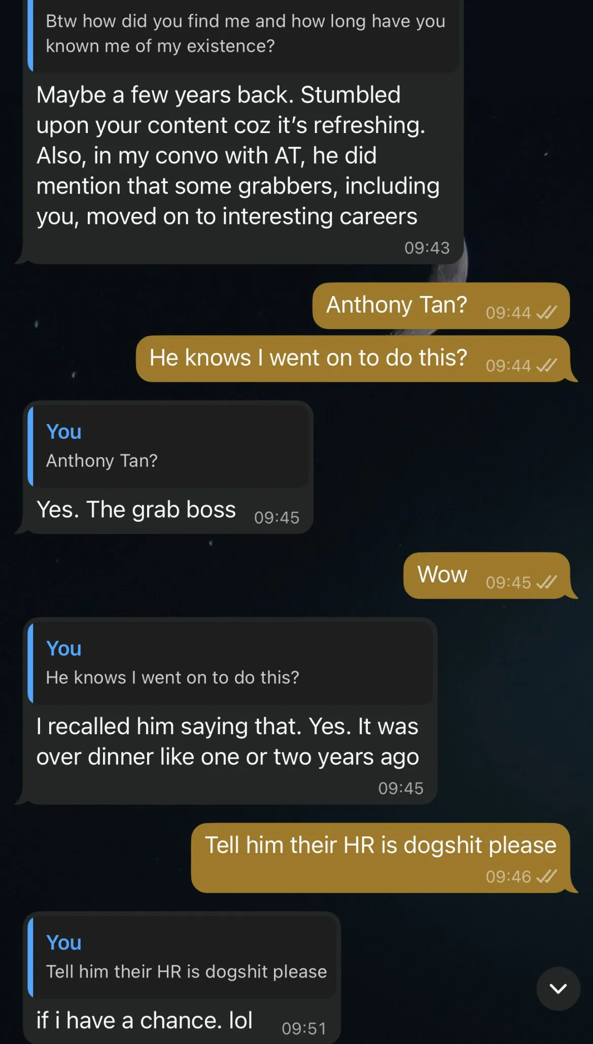 I know I’m not supposed to have an ego as a Buddhist. But hey hey~! It does feel good knowing that your ex-big boss caught wind of who you are. Oh, for those who don’t know, yes, I used to work at Grab (not as a driver). If you ever took GrabFamily – I launched that. And if you ever got banned from the platform before, that was me too!