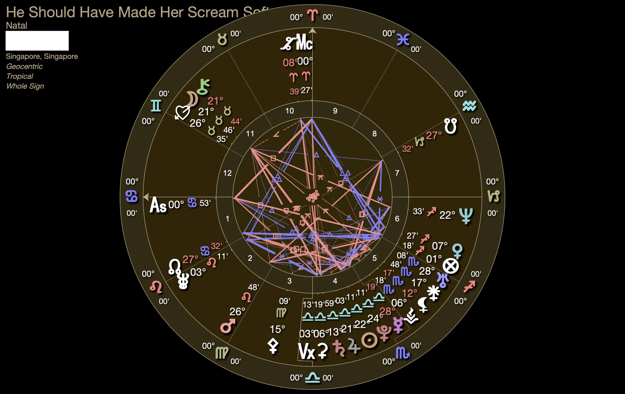 I think the worst thing about this chart is that her 1st House Ruler is weak and influenced by a weak dispositor (Saturn). Neptune’s transit into her 1st House is not great because her Neptune is unfortunately influenced by her Saturn as well. To put it simply, she is definitely a go-getter with something to prove, but 心机 is perhaps a little 重。 Morals, amongst other biological traits, are also very, very loose.
