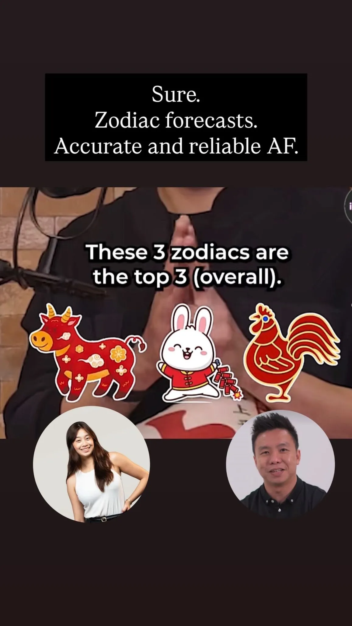 The above image is perhaps the greatest irony because we started off the year with one of the greatest scandals in decades. The same practitioner commented that Ox and Rooster are gonna have a great year. Heavens are on my side this year because it keeps giving me God-tier examples of why annual zodiacs are such bloody bulls***.